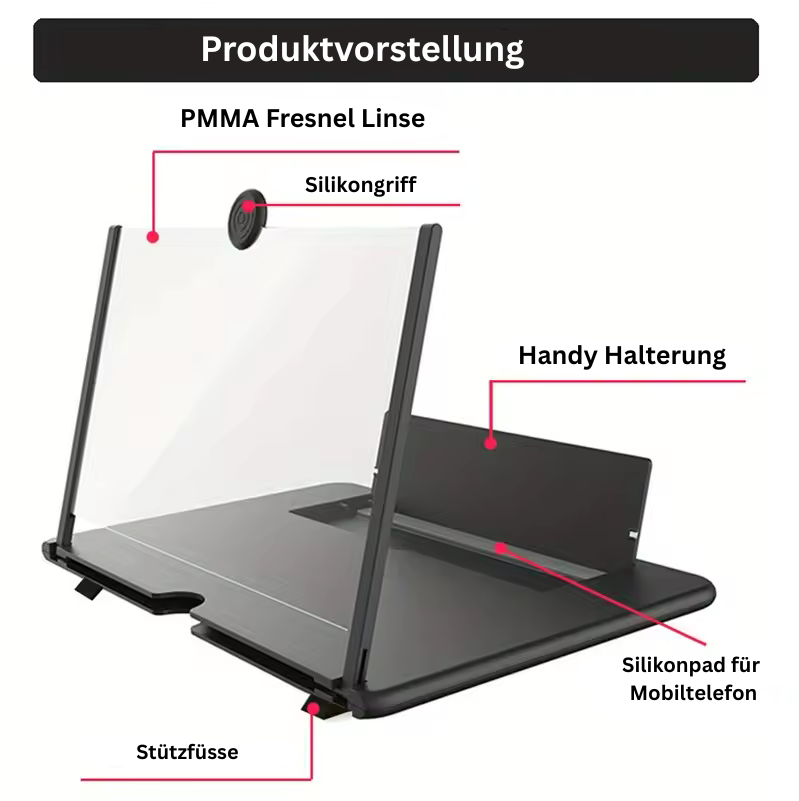 So funktioniert ViewBoost. ViewBoost ist ein tragbarer Bildschirmvergrösserer, der den Inhalt deines Smartphones bis zu 3-fach vergrössert. Er besteht aus einer speziellen Lupe, die das Display optisch vergrössert, ohne die Bildqualität zu beeinträchtigen. Die Konstruktion ist kompakt, leicht und robust, perfekt für unterwegs oder den Alltag. Egal ob du Filme schaust, liest oder Apps bedienst – mit ViewBoost siehst du alles deutlich grösser und entspannter. Die einfache Handhabung und universelle Passform machen ihn zu deinem praktischen Begleiter.